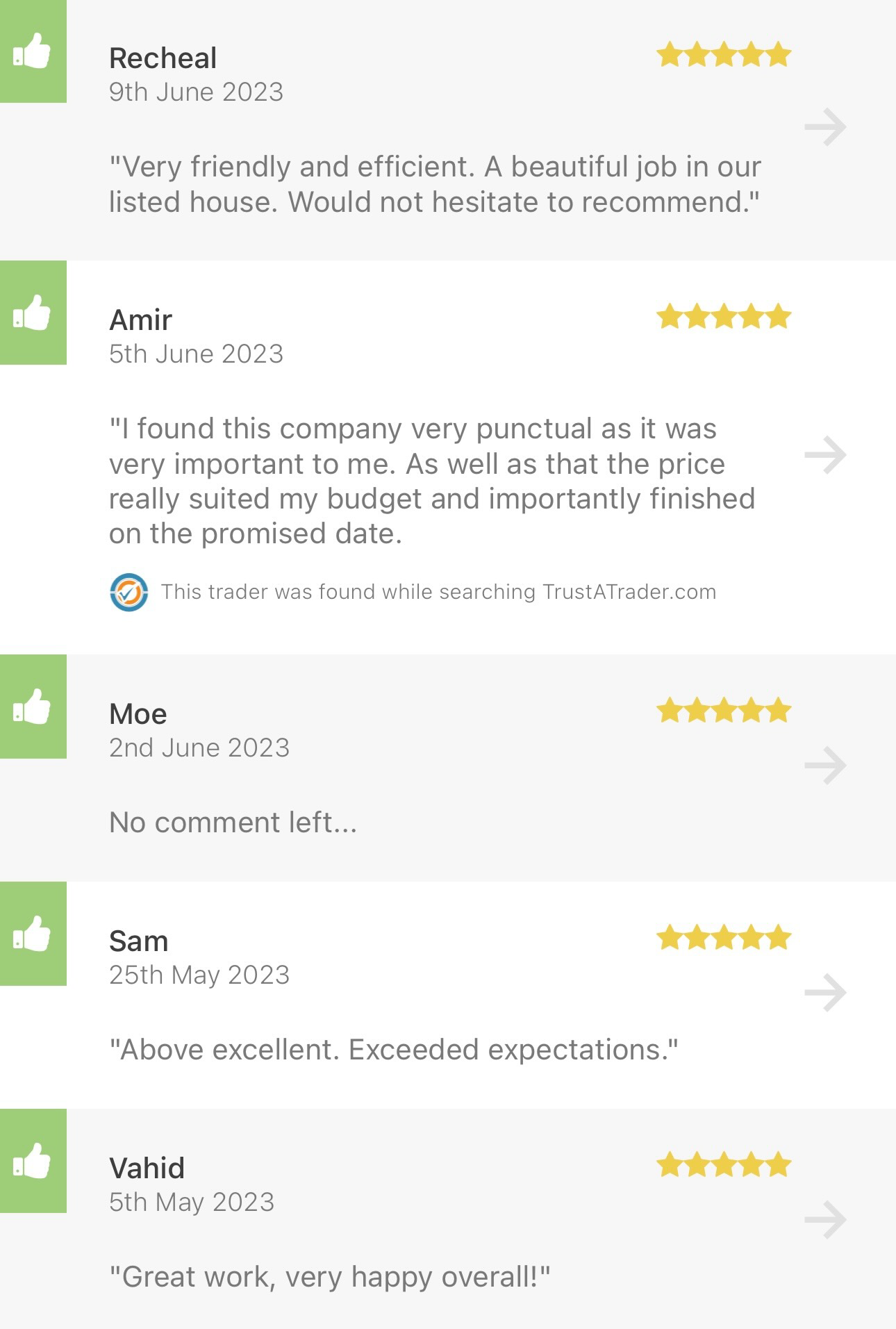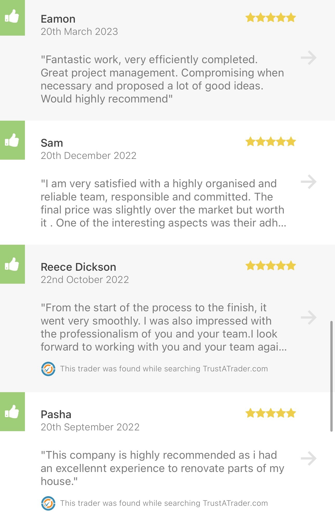 Our testimonials consistently emphasise the high standard of workmanship delivered by our skilled builders, tradespeople, and project managers. Whether it’s a kitchen renovation, bathroom remodel, loft conversion, or full‑scale home refurbishment, clients appreciate the precision, care, and pride our team brings to every task.